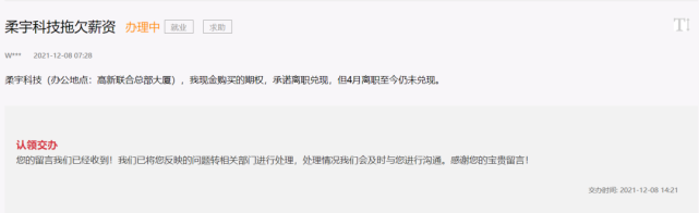 另有网友表示,其此前用现金购买了柔宇科技的期权,并得到承诺,离职时兑现。然而,该网友自4月离职至留言日仍未得到兑现。