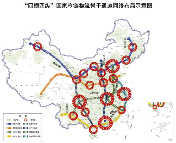 该《规划》提到建设“四横四纵”8条国家冷链物流骨干通道,布局建设100个左右国家骨干冷链物流基地,到2025年,初步形成衔接产地销地、覆盖城市乡村、联通国内国际的冷链物流网络,实现冷链物流成本水平显著降低,服务能力显著增强,形成一批具有较强国际竞争力的综合性龙头企业。