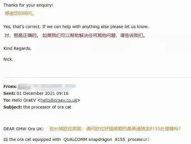 在欧洲英国市场,根据一名网友提供的邮件截图,他询问长城欧拉英国,当地的好猫是否搭载高通8155,得到了肯定的回答。