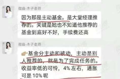 不久前,“木子老师”在授课时称:“银行的理财产品更不要买,因为那是主动基金。是大堂经理推荐的……基金分主动和被动,主动是别人推荐的,是为了完成任务的。收益率低得可怜,4%左右,通胀可是10%呢。”