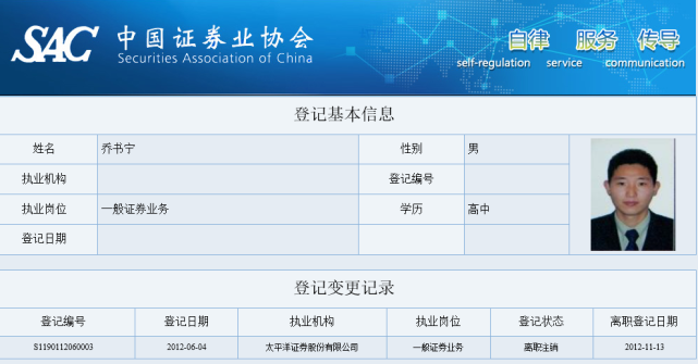 雷达财经通过中国证券业协会查询发现,乔书宁执业岗位为一般证券业务,学历为高中。