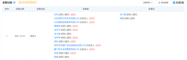 天眼查资料显示,12月21日,智者科技股东北京创新方舟科技有限公司、北京搜狗信息服务有限公司、深圳市利通产业投资基金有限公司、厦门思元投资管理有限公司、黄继新、金京华、李申申等集体退出,变更后公司股东仅剩创始人周源和现任首席技术官李大海,当前二人分别持股99.30671%和0.69329%。