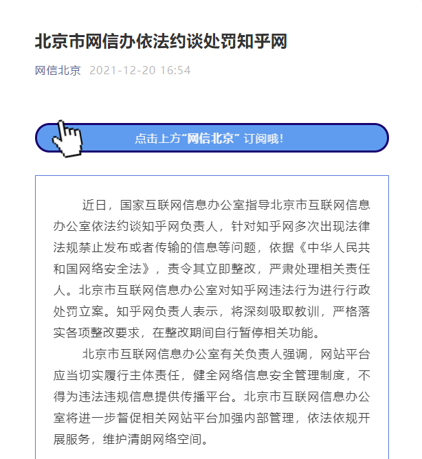 12月20日,北京互联网信息办公司官网微信《网信北京》发布通报称,北京市网信办依法约谈处罚知乎网。
