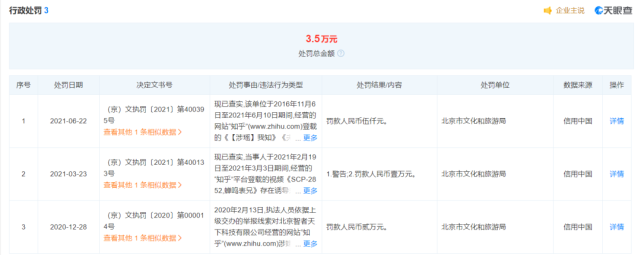 在天眼查资料中,近两年知乎关联公司智者科技先后被北京市文化和旅游局处罚三次,共计罚款3.5万元。