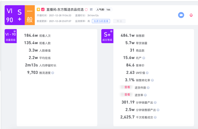 这种文化人式的直播带货风格,一直延续了3小时。据直播数据统计平台灰豚数据显示,本场直播观看人次达184万,人数峰值3.3万,直播销量5.7万件,直播销售额484万元。