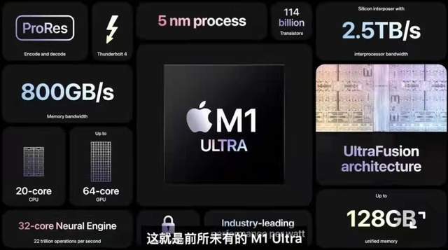 简单来说,苹果是通过UltraFusion封装架构封装了两颗M1 Max芯片,能不强么?苹果官方数据,20核心,性能要比市面上16核台式机芯片强90%,直接干翻英特尔和AMD…