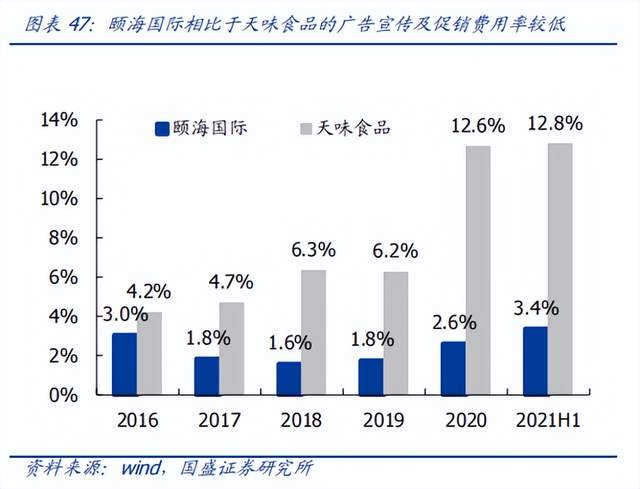 两家的关系在餐饮行业人尽皆知,线下商超中它们的名字也几乎同时出现,而有了海底捞的品牌做背书,颐海国际节省掉不少营销费用。比如在广宣费用促销费用率上,颐海国际明显低于竞争对手天味食品,2020年两者的广宣及促销费用率分别约为2.6%和12.6%。