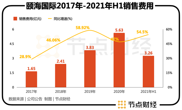 在品牌上,颐海国际也增加了更多的投入。2021年上半年,公司销售费用为3.26亿元,同比增长达54.5%,占营收比重也达到12.5%。而对比过去几年,特别是2017年之后,公司陆续推出“筷手小厨”、“悦颐海”、“哇哦”等原创品牌之后,销售费用增幅明显。