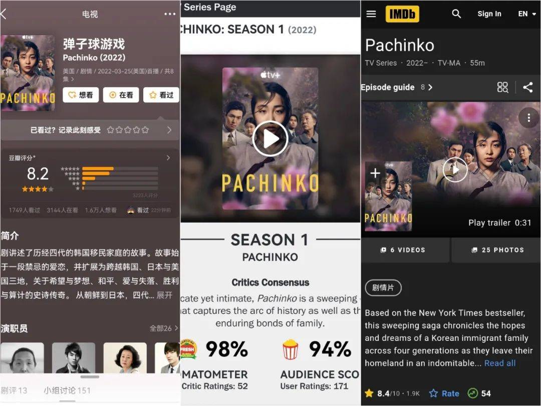 自3月25日上线后,《柏青哥》收获了相当高的口碑和业界的赞誉,IMDb评分达到8.4,烂番茄的新鲜度保持在98%,国内豆瓣开分后也成为超8分的优质剧集。《Rolling Stone》形容该剧是“一首历史史诗”,《The Hollywood Reporter》盛赞它是动人心魄的“永恒序曲”。