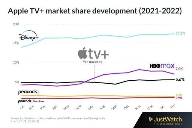 根据JustWatch的报告,Apple TV+截止今年2月5.6%的市场份额,正向HBO Max的7%逼近。