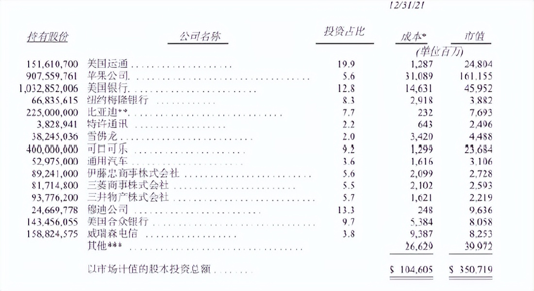 伯克希尔截至2021年12月31日最新15大持仓情况