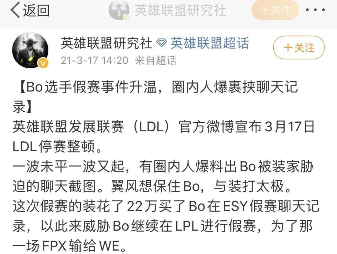 值得注意的是,Weiyan、bo、Condi、Jay等选手参与假赛的消息,几乎都是庄家爆料的。虽然Bo当时被定义为“自爆”,但当时有相关爆料称,一位想要操盘的庄家花费22万买了Bo在LDL时期的假赛证据,以此要挟他打假,当时Bo已经进入LPL,战队表现更是势如破竹,Bo才不得已向FPX俱乐部坦白。