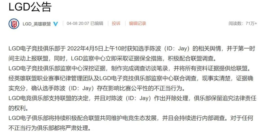4月5日,LGD中单选手陈波(Jay)被爆料参与假赛,东窗事发后,LGD俱乐部第一时间上报英雄联盟官方纪律管理委员会处理。4月8日,联盟调查结果公布,经查证,Jay确实存在影响比赛公平性的不正当行为,并参与了非法组织的赛事投注,被处以终身禁赛的处罚。