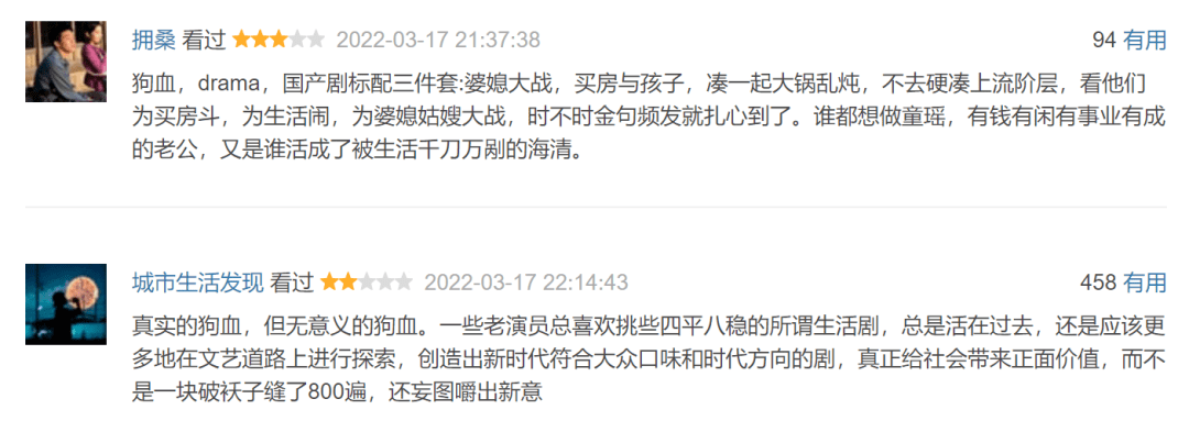 某种程度上,写实依旧是《心居》的一大亮点,用细节丰满人物也是滕华涛擅用的人物刻画方式。但是,如果说前几集频繁的家庭争吵、姑嫂矛盾还能借助对社会痛点的感知与观众共情,那么后续持续堆叠的俗套桥段,就只能不断消耗观众的耐心,剧集也随之在低迷的口碑反馈中陷入三观不正的争议。