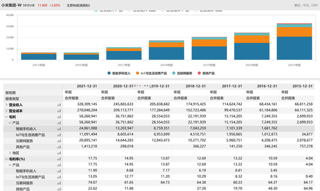 根据小米2021年年报,其硬件(智能手机+IoT与生活消费产品)仍然贡献了70.64亿元的毛利润,占其整体毛利润的55.6%,是其主要的利润来源;同时,其2021年的硬件业务中,手机产品毛利润率达到了11.90%,IoT产品的毛利润率更是达到了13.05%;同期内,小米的综合毛利润率达到了17.75%,净利润率也达到了5.87%——这恐怕是当初雷军所想不到的。