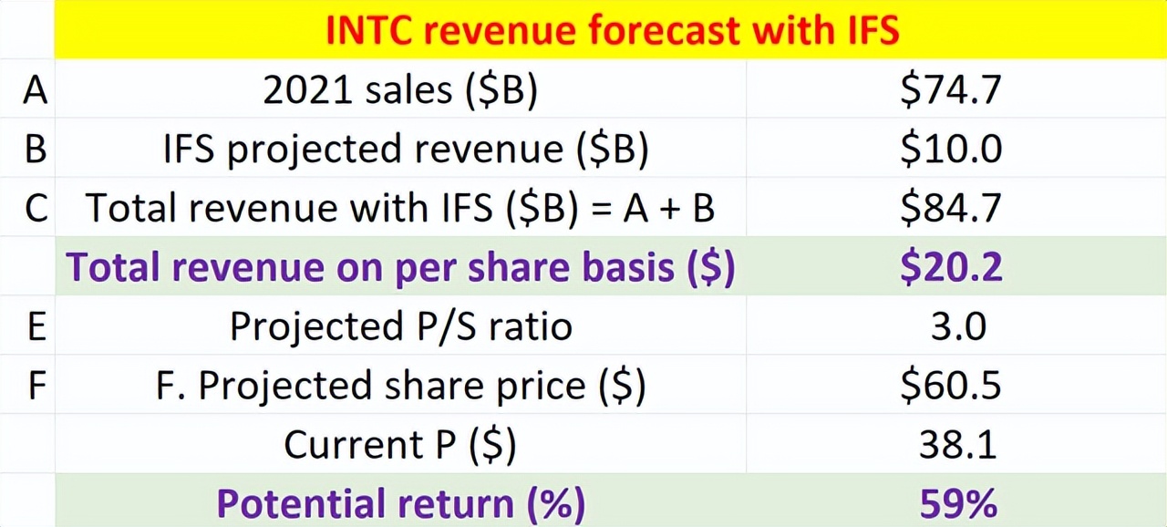 预计全球代工行业将在未来几年内成长为价值 1000 亿美元的潜在市场。我预计 INTC 的 IFS 将在几年内拥有约 10B 美元的市场份额(以 0.5 倍资产周转率投资 20B 美元),如下表所示。因此,即使假设其当前的核心业务完全停滞在 2021 年的水平,一旦其 IFS 上线,总收入将为 $84.7B,或每股 $20.2。以 3.0 倍市盈率计算,预计股价将为 60.5 美元,较当前价格上涨约 59%。