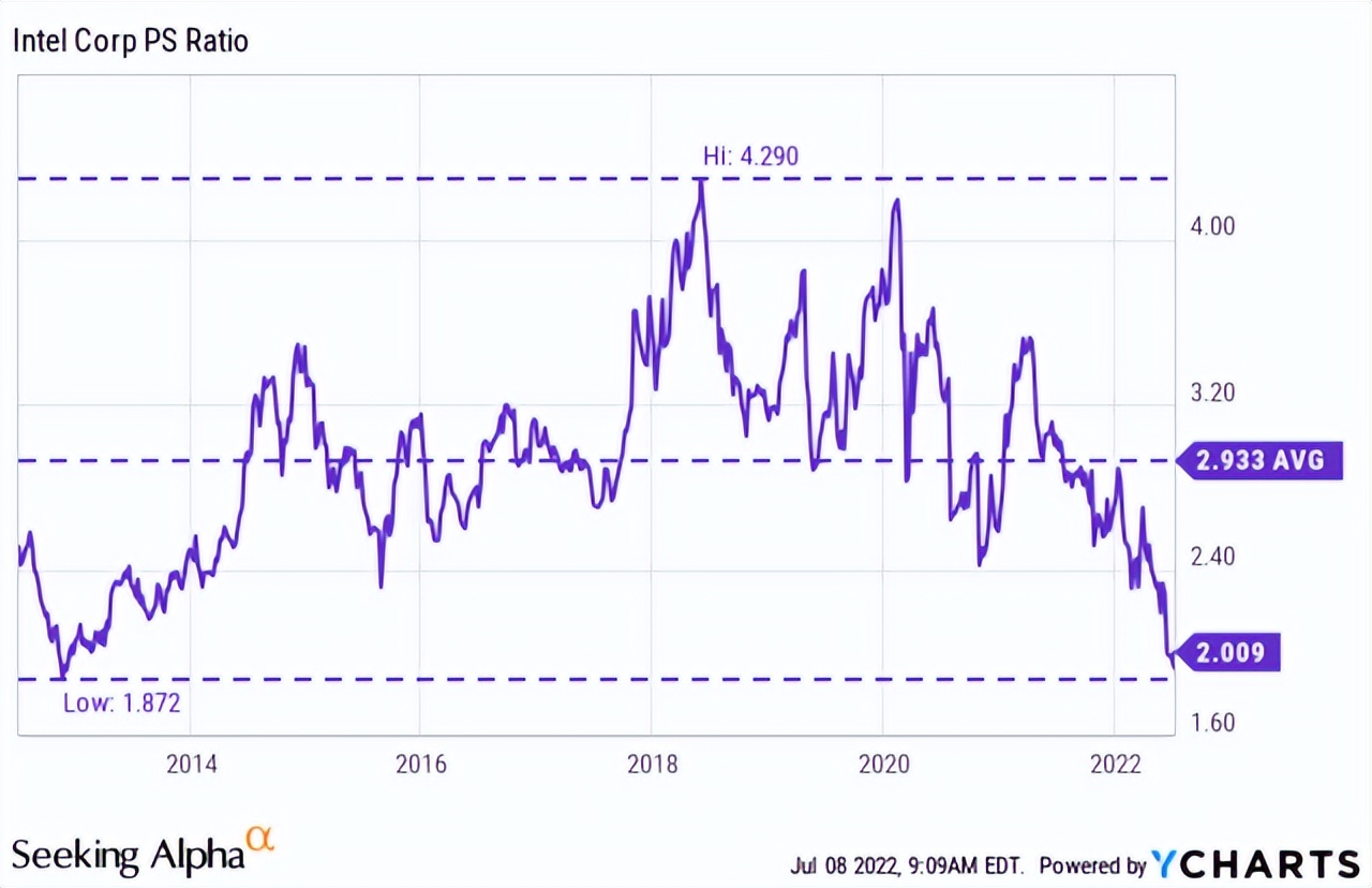 如下图所示,INTC 目前的估值约为 2.0 倍市销率(“P/S”),接近十年来的最低水平。无论是相对而言还是绝对而言,它都太便宜了。从历史上看,该股的平均市盈率在 1.8 倍至 4.2 倍之间,长期平均市盈率为 2.9 倍。