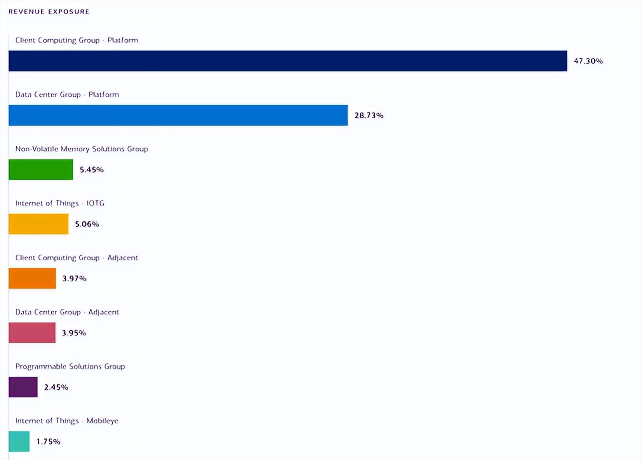 其 2021 年的总收入为 $74.7B。其现有的核心芯片业务(客户端计算集团和数据中心集团)产生了约 75% 的总收入,折算成约 $56B。假设 P/S 比率为 3 倍,接近其历史平均水平,这两个现有内核将价值 $168B。以撰写本文时的股价计算,其市值约为 $153B。因此,投资者以略微折扣的价格获得核心业务,并免费获得所有其他组件。
