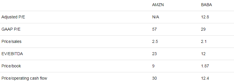 在下表中,我为亚马逊和阿里巴巴编制了一些估值指标: