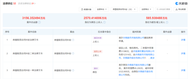 天眼查资料显示,在永辉超市的司法解析中,案由为房屋租赁合同纠纷的共有32件,涉案总金额为3156.35万元。