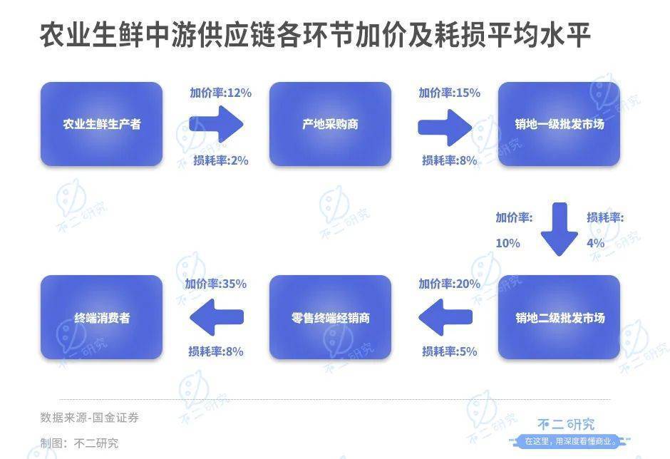 据国金证券研报显示,从产品属性角度看,水果为非标准产品,种植端和零售端均较为分散,从果园到零售商可分为采摘、分选、包装、保鲜、储存、运输等多道程序,且大部分分销商仅能覆盖一部分程序。因此形成了冗长、高度分散且涉及众多中间商的行业痛点,漫长的分销过程不可避免地导致了高损耗率和受限的运输半径。