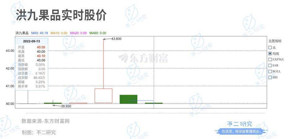 上市仅仅6个交易日,截至9月13日港股收盘,洪九果品报收40.00港元/股,对应市值186亿港元。