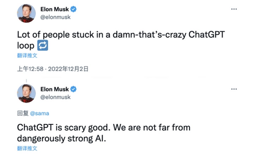 连马斯克都忍不住感叹:“ChatGPT好得吓人,我们离强大到危险的人工智能不远了。"