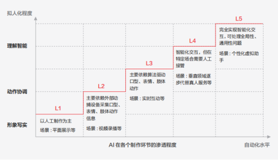 以数字人为例,"拟人化"和"自动化"是判断一个数字人等级的标准。在这个标准下,数字人被分为了L1-L5五个等级。其中L4级别的数字人能够实现部分智能化交互;L5级则能够实现完全智能化交互。从L4级别开始,数字人能够逐渐替代真人去完成服务。