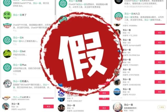 辟谣文章的配图中,均是与“文心一言”相关的公众号和抖音号,并被标上了“假”的标签。