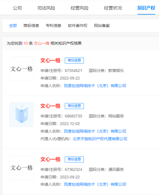 值得关注的是,2022年8月,百度推出了AI作画产品“文心一格”。文心一格的知识产权大部分申请人为百度在线网络技术(北京)有限公司,由百度控股有限公司全资持有。