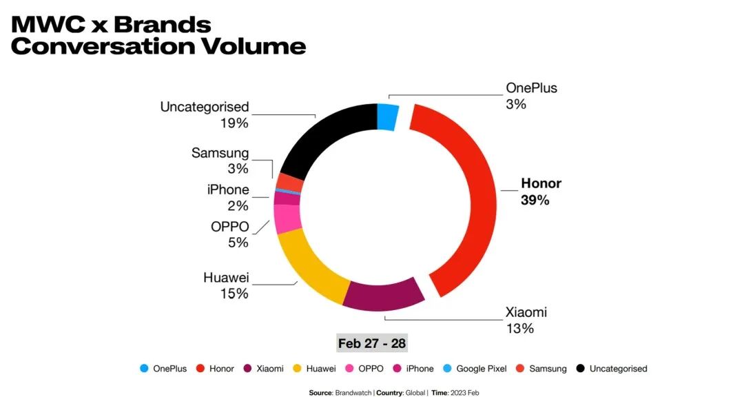 (2月27日-2月28日MWC各品牌讨论声量占比,来源:Brandwatch)