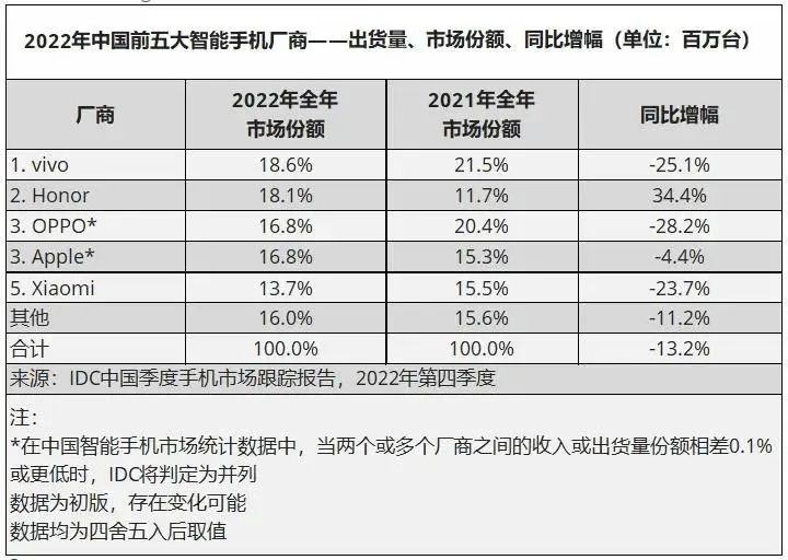据IDC发布的2022年中国智能手机相关排名报告显示,中国前五大智能手机厂商分别为vivo、荣耀、OPPO、苹果、小米。其中,OPPO、小米在2022年市场份额同比分别下滑都超过了20%以上。即便强势如苹果,也难“逆流而上”,没能逃脱市场份额下滑了4.4%的结局。