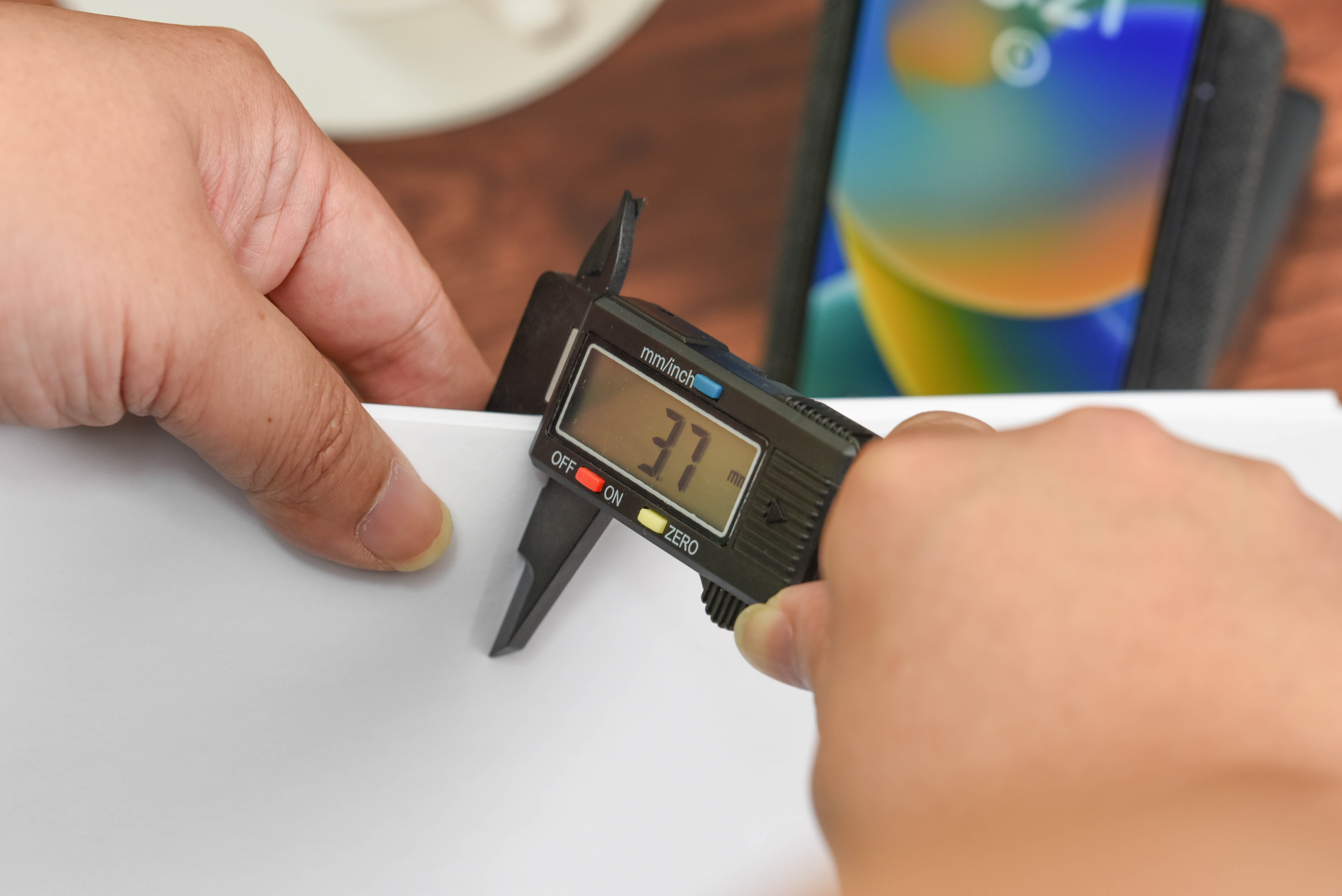 让我们祭出游标卡尺,40张A4纸厚度在3.7mm。适配iPhone 13 Pro的手机壳大多维持在1~2mm厚,无需担心充不上电的情况。