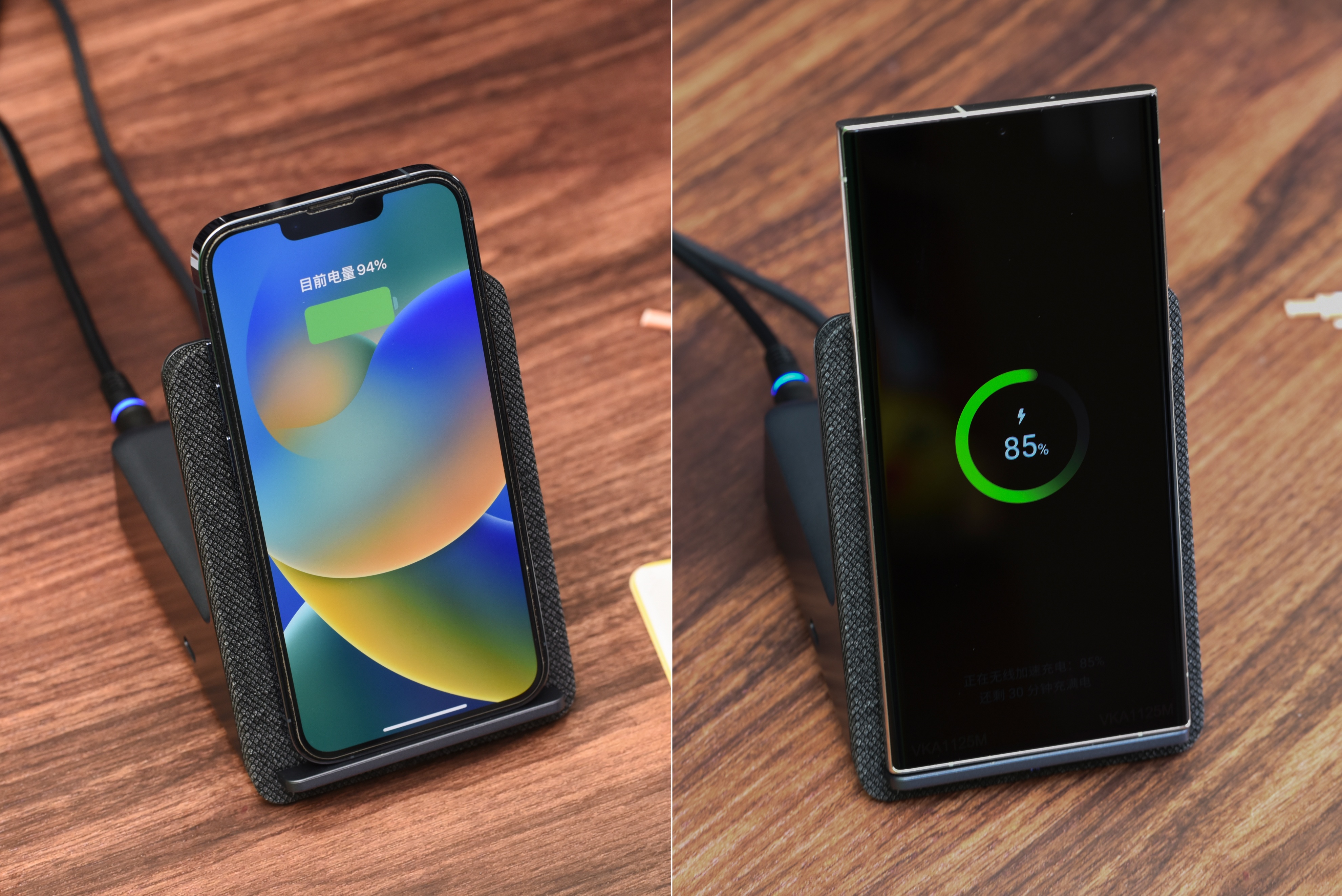 支持Qi标准的另一个好处,就是很好的兼容性。我们测试了iPhone 13 Pro和三星S23 Ultra两款手机,都可以做到即放即充,Android和iOS设备都能用。