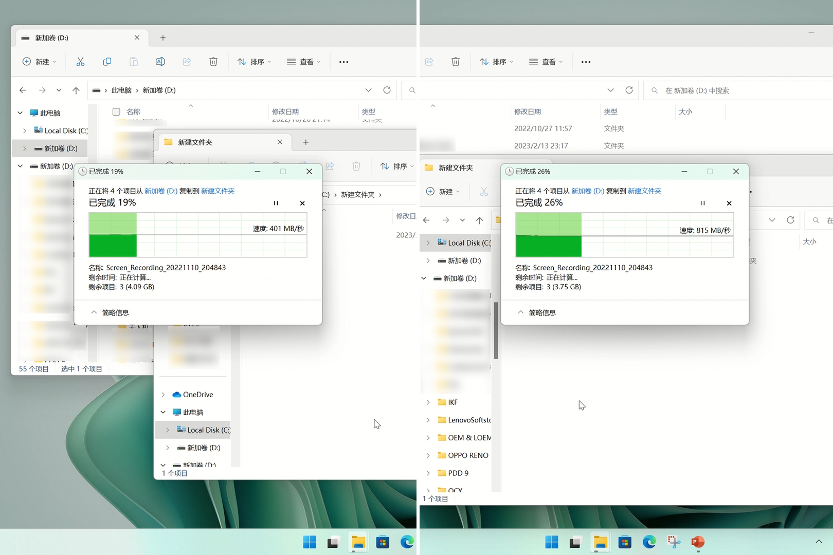 另外,我们还测试了一下HD22Q的数据传输性能,来看看传输大文件时的性能表现。我们使用同一个SSD硬盘盒拷贝5.1GB大小的视频素材文件,分别使用USB-A线缆以及USB-C线缆连接HD22Q,测试数据传输速度。