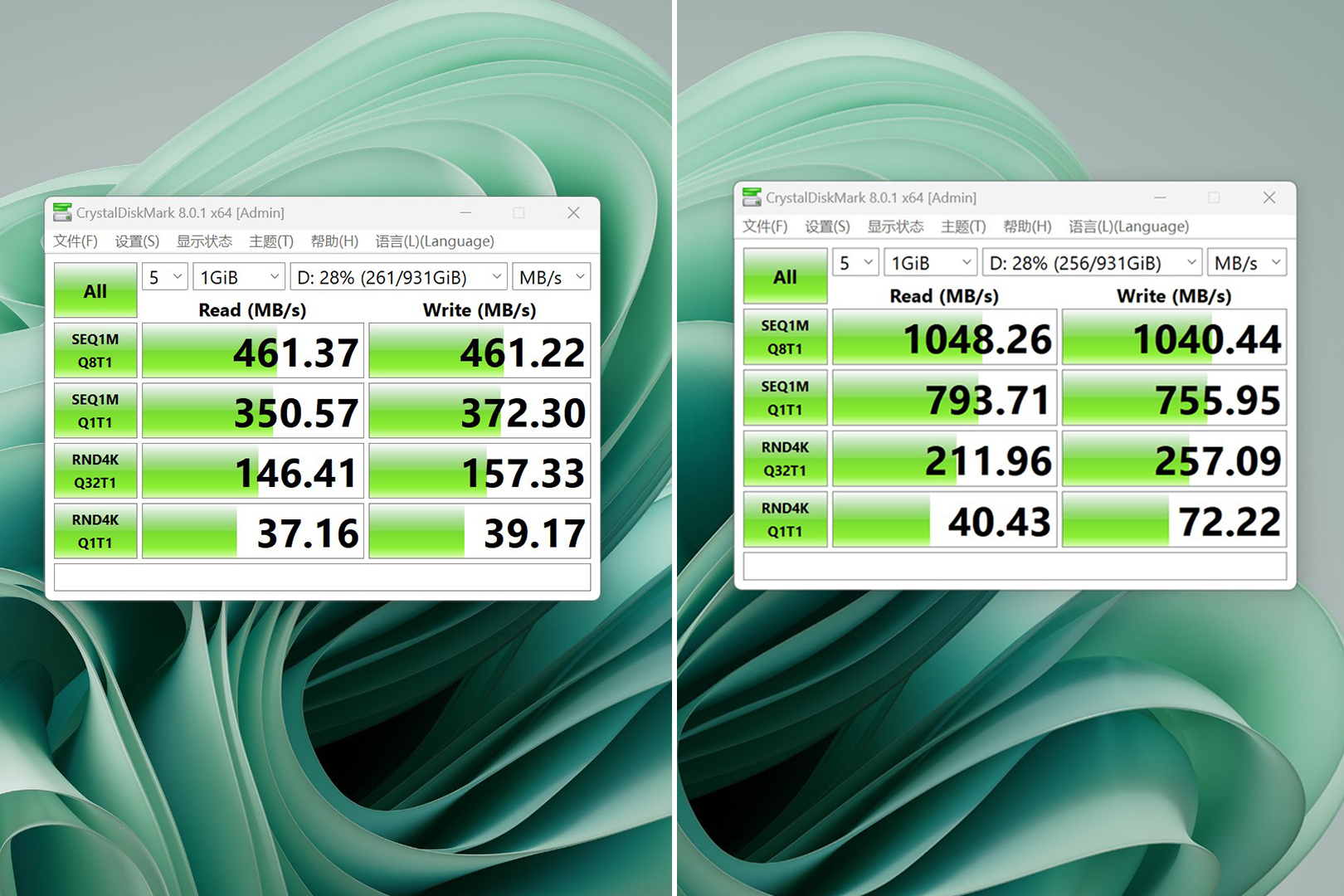 同样,我们使用测试软件分别测试,USB-A口的随机读取速度在461.37MB/S、写入速度在461.22MB/S;而USB-C接口则快了很多,分别为1048.26MB/S及1040.44MB/S。