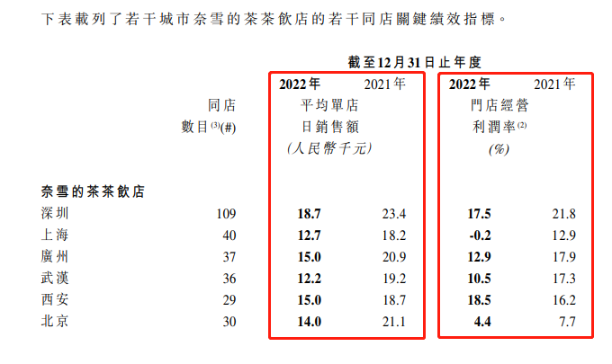 而在门店层面,奈雪的茶茶饮店的若干同店关键绩效指标的表现也不容乐观。 去年奈雪的茶茶饮店在深圳、上海、广州、武汉、北京等城市,同店的平均单店日销售额及门店经营利润率指标均有不同程度的下滑。