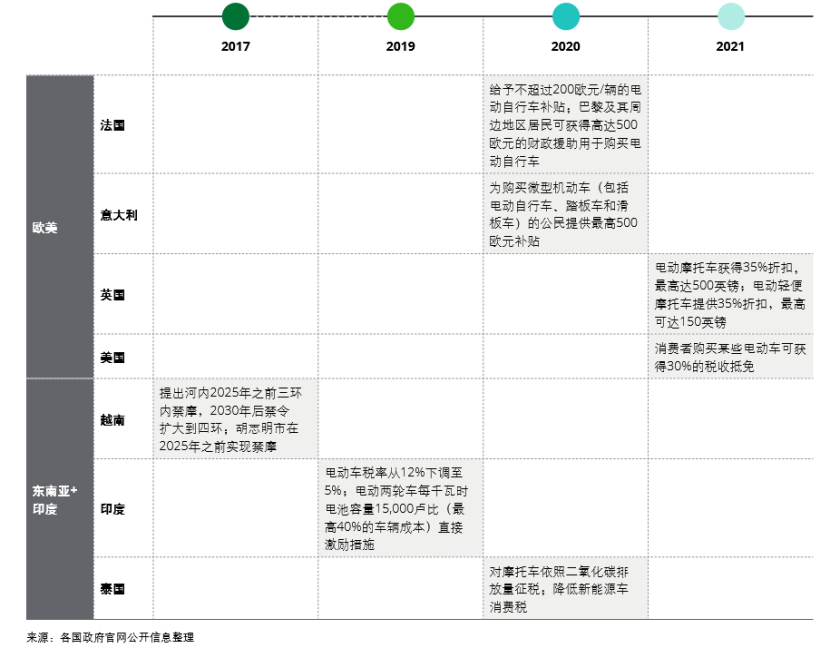 <h2>03 海外是新机遇吗?</h2>受益于“碳中和”,各国纷纷出台了电动两轮车补贴政策。2017年:越南河内市议会决定在2030年彻底禁止摩托车上路;2019年8月印度电动车相关税率从12%下调至5%,且消费者将获得15万卢比所得税减免。印度提出自2023年起,所有在售的三轮车将全部转型为电动车。自2025年起,所有在售的150CC以下的两轮车将全部为电动车。