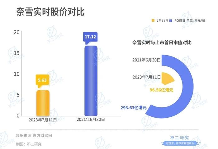今年3月份,奈雪公布2022年年报,年报公布后的首个交易日,奈雪股价上涨16.94%,可惜好景维持不长,进入7月份,奈雪的股价一度跌至5.63港元/股,约折合人民币5.18元,对应市值96.56亿港元,约折合人民币88.85亿元;对比IPO首日,其市值下跌近200亿港元。