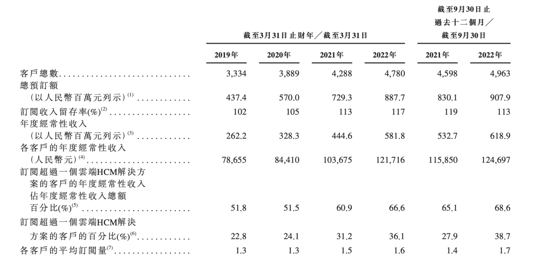 在客户留存方面,北森也略胜一筹。据招股书,截至2022年9月30日,过去12个月NDR(订阅收入留存率)为113%。但从客户数量来看,从2021年的4598名客户到2022年的4963名客户,增加的客户数为365名。另外,截至2022年9月30日,北森有约80%的客户拥有近五年的预期客户生命周期。从而可以推断,客户流失率约20%。
