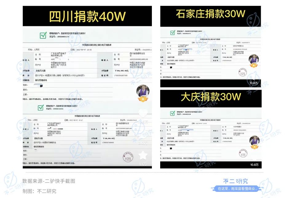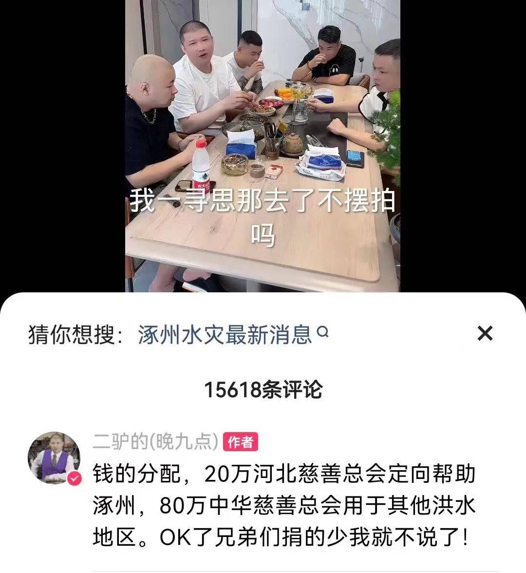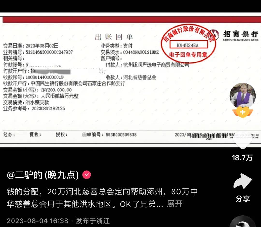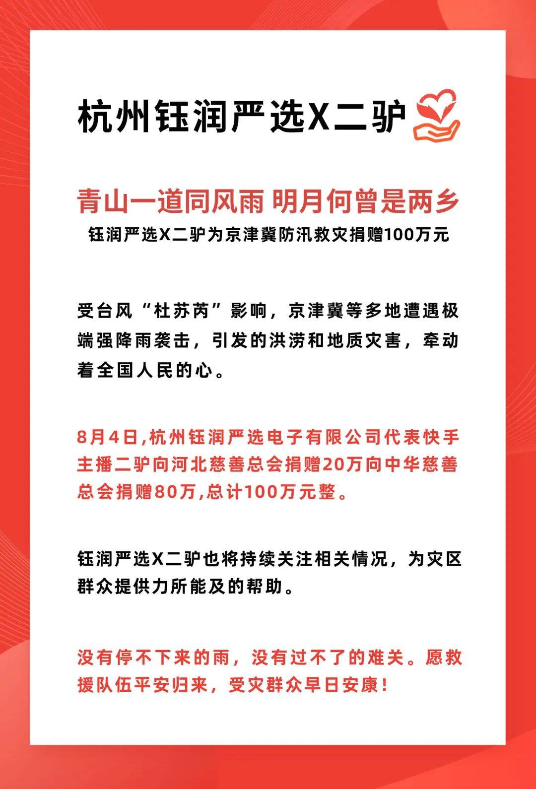 8月3日,快手顶流主播「二驴」捐赠100万。其中,向河北慈善总会捐赠20万定向帮助涿州,向中华慈善总会捐赠80万用于其它地区的赈灾。