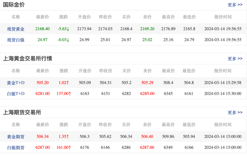 受到带动,以人民币计价的黄金价格也在强劲上涨。截至3月14日下午,上海黄金交易所的黄金T+D为505元/克,上海期货交易所黄金期货为506元/克。