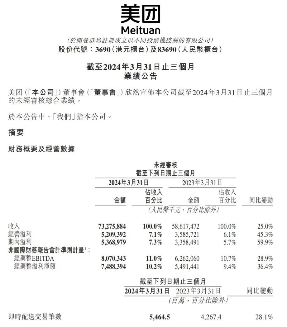 6月6日,美团发布2024年一季度财报,数据显示,美团实现营收732.76亿元(人民币,下同),同比增长25%。净利润为53.69亿元,同比增加59.9%;非国际财务报告会计准则计量,经调整净利润为74.88亿元,同比增长36.4%。