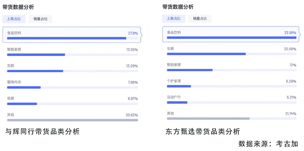 两者在直播带货类目上有较大重叠,与辉同行带货品类中,食品饮料、智能家居、生鲜位于前三名,而东方甄选同样如此。