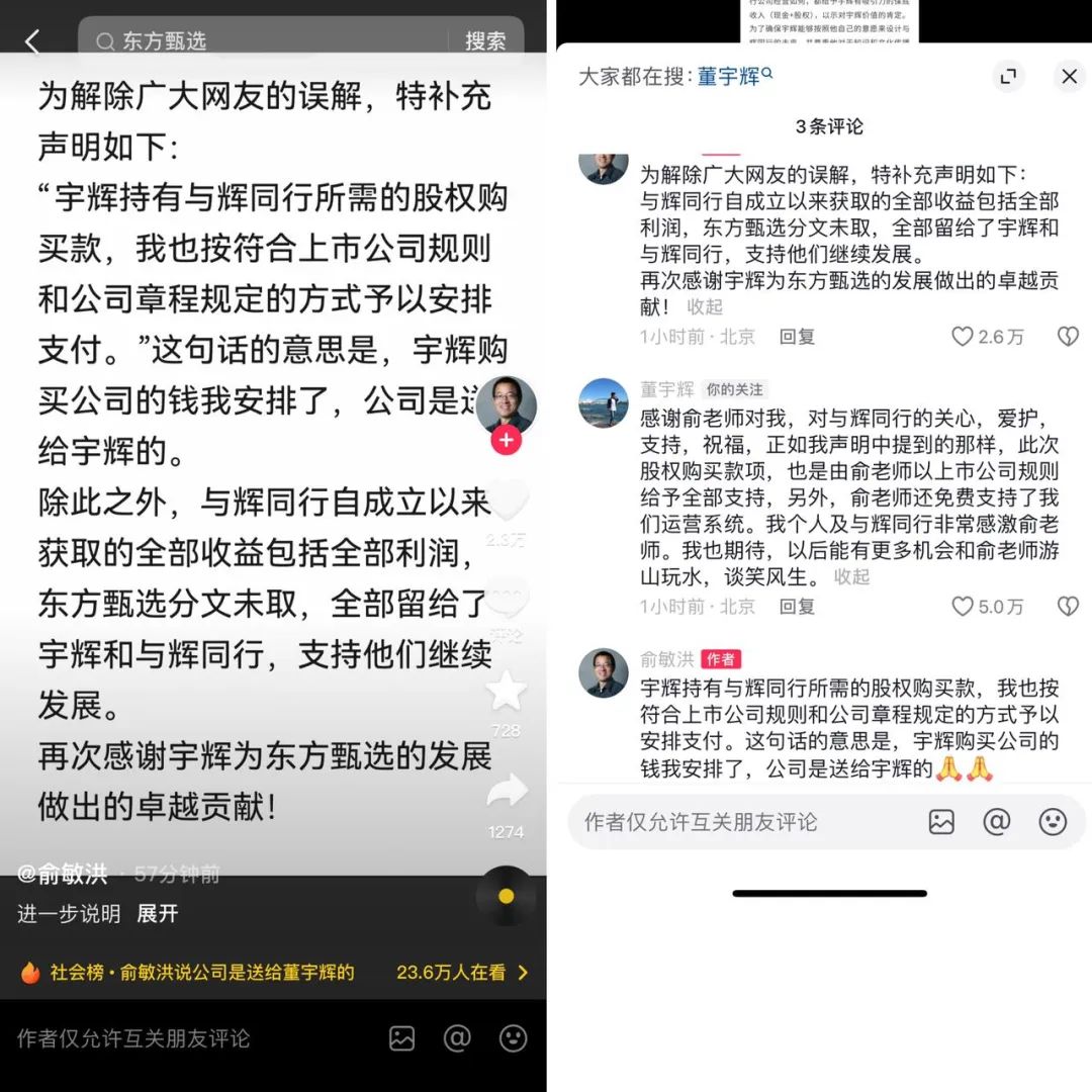 此外,俞敏洪还进一步解释说明了公告中的信息,“宇辉购买公司的钱我安排了,公司是送给宇辉的”,“与辉同行自成立以来获取的全部收益与利润,东方甄选分文未取”。