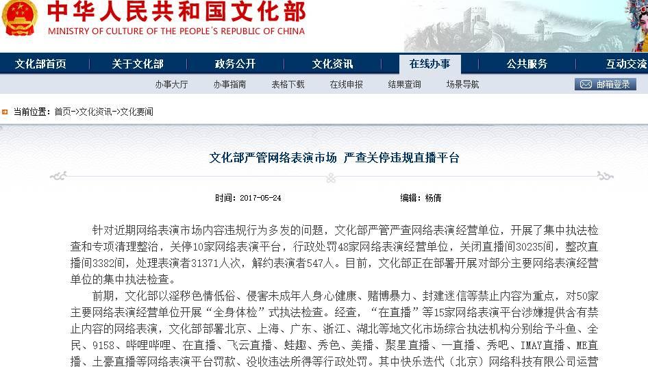 前期文化部对50家主要网络表演经营单位展开全面的执法检查。检查重点是淫秽色情低俗、侵害未成年人身心健康、赌博暴力、封建迷信等禁止内容。