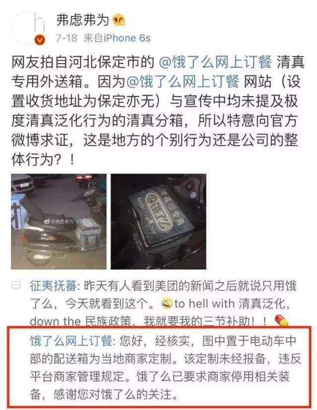 事情是这样的,有网友在微博上表示,看到饿了么也有清真专用的外卖箱,对此,饿了么在微博下的解释为,外卖箱是当地商家定制,未经报备,并已要求停用。