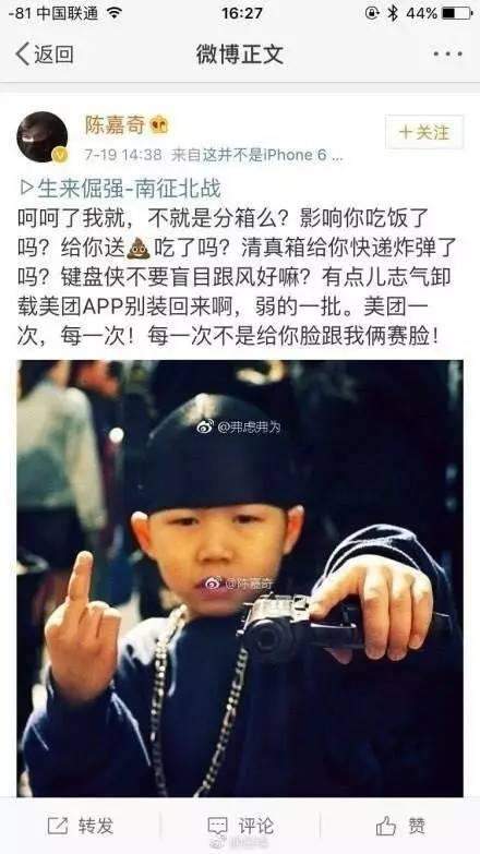 但是,美团这次的“猪队友”也不只这位张伟,还有一位微博认证为“美团网商户运营专员”的陈嘉奇”,他在微博上发表了这样的言论: