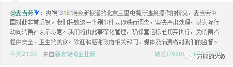 与海底捞的危机公关类似的案例,比较经典的应该是2012年的央视315晚会曝光麦当劳食品安全问题。当时,麦当劳的危机公关是:1、1个小时内在微博上回应此事,称“个别事件”;2、在门口贴道歉信。