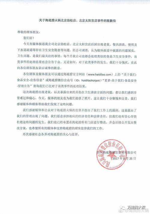 大叔看到好多网友评论,大致的意思是海底捞的危机公关做得太好了:毫不避讳问题……对于一个追求极致口碑的品牌而言,不诚实没有任何退路,诚实需要足够大勇气……“情况属实”真是少见的一股清流啊……